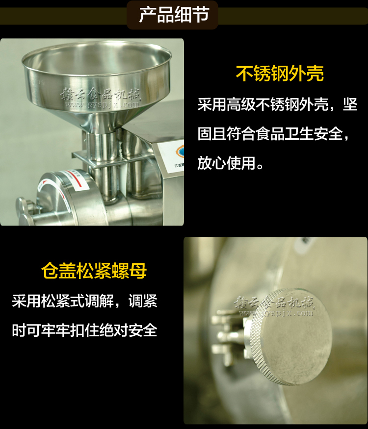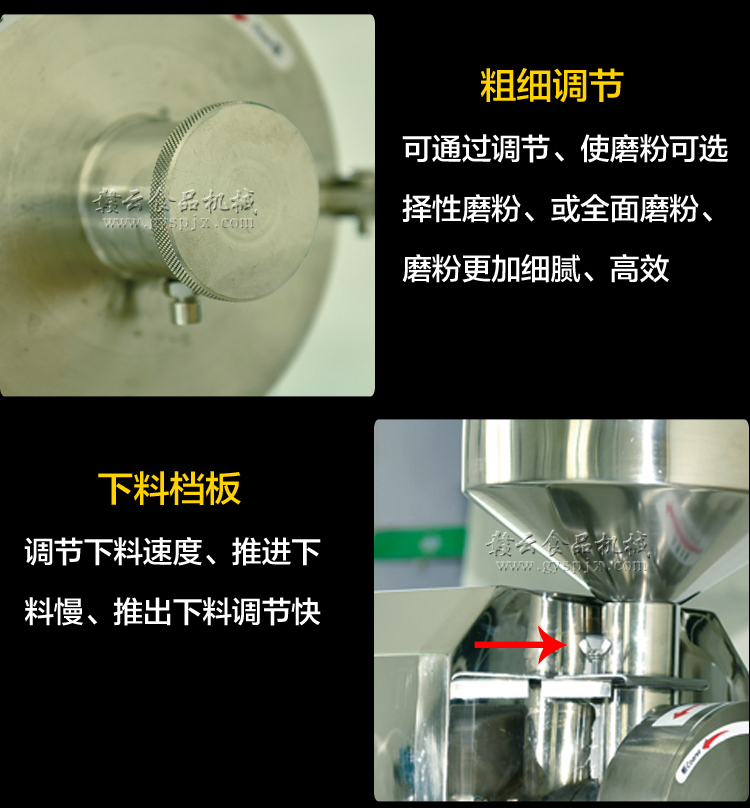 贛云不銹鋼磨粉機有1100型、2200型和3000型三種型號,這款是3000型不銹鋼磨粉機,造型外觀和2200型相同,采用干濕磨盤以及全不銹鋼構架,外形美觀大方,亮光,不銹鋼色澤清洗,采用3kw大功率純銅電機帶動磨盤轉動,磨粉細度可調,適合磨不同粗細的五谷,米漿等。