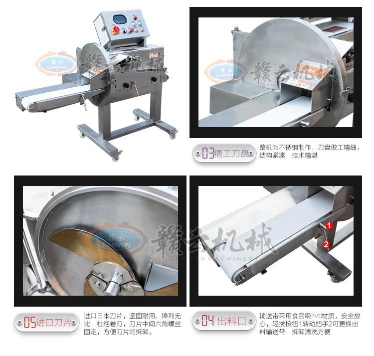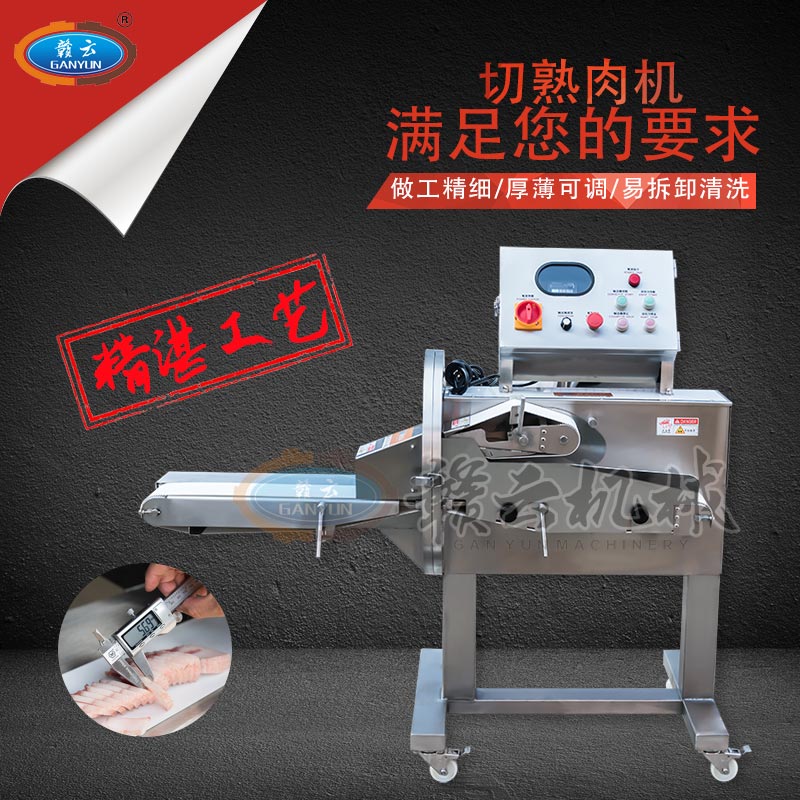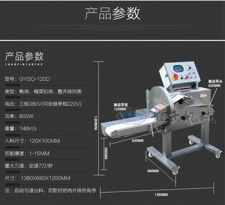 GYSQ-120D切熟肉機,專業(yè)切熟肉機可切扣肉、鹵豬耳朵、五花肉等,通過調整輸送帶的速度控制切割厚度,輸送帶越快厚度越厚,越慢越薄。適用于食堂、中央廚房、餐飲配送中心、肉聯(lián)廠、大型酒店等。變頻電控箱,通過調節(jié)輸送帶速度控制切割厚度,按鍵防水設計,可拆卸輸送帶。優(yōu)質刀片,杜絕卷刃。