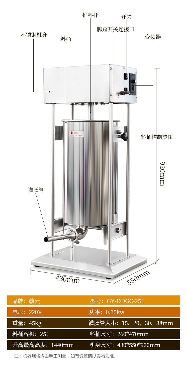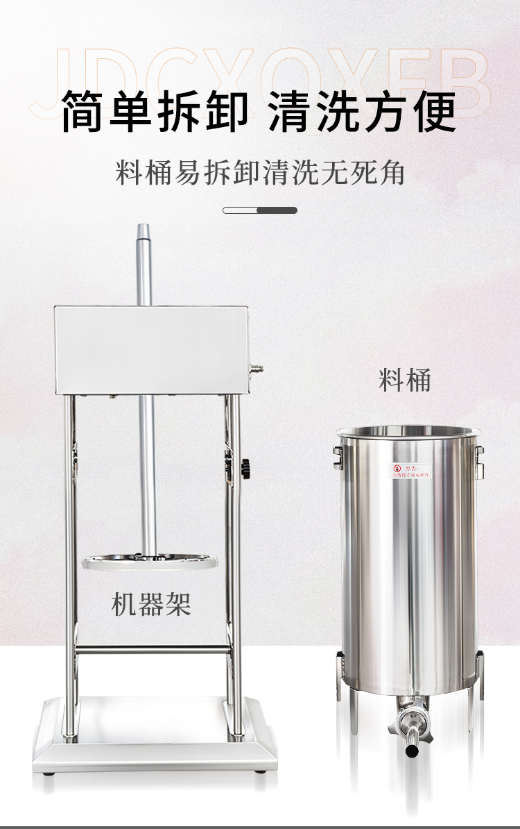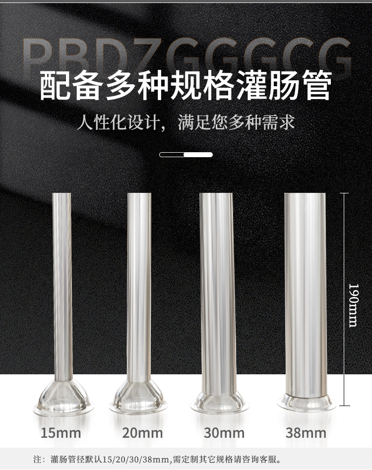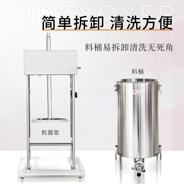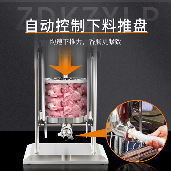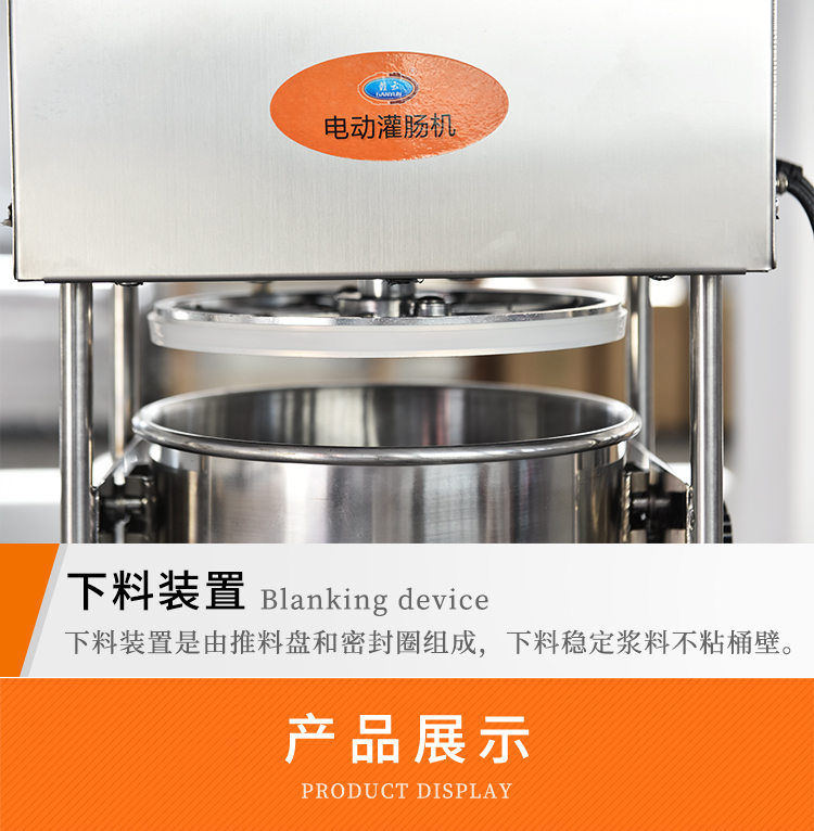 贛云機械電動灌腸機采用不銹鋼材質,灌腸機可以單人操作,實現(xiàn)輕松灌腸機,下料裝置是由推料盤和密封圈組成,通過電動驅動,均速下推力,讓下料穩(wěn)定漿料不粘桶壁。機器適用物料范圍較廣,無論是四川香腸,湖南臘腸,脆皮腸,山東香腸,廣式臘腸,河南臘腸都可以輕松灌制