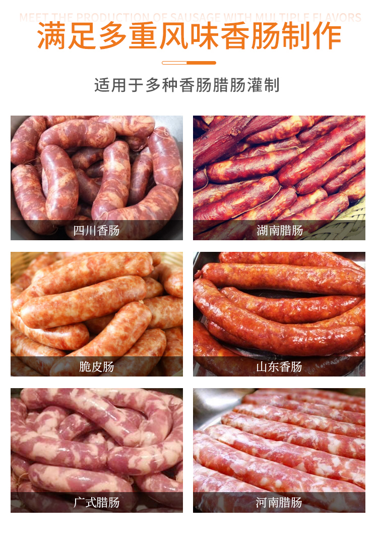 適用于四川香腸、湖南臘腸、脆皮腸、山東香腸、廣式臘腸、河南臘腸等生產(chǎn)加工