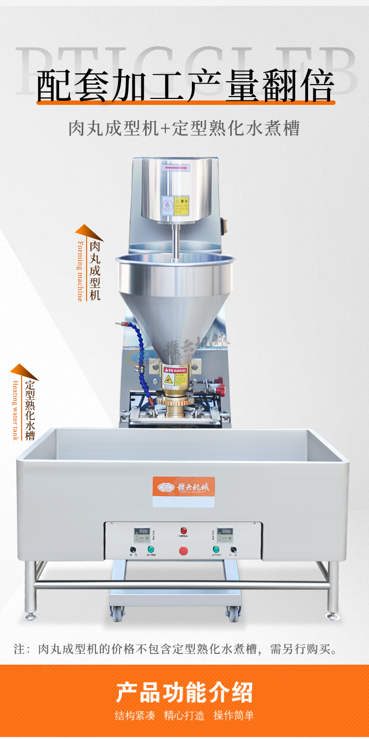 本款實心肉丸成型機是在120型實心肉丸成型機的基礎上加高設計,是配合我司設計的雙加熱水槽而設計,隨機配16、20、26MM三套成型模具,可做三種規(guī)格丸子,采用絞龍推料擠壓,切刀快速切割成型原理設計,每分鐘可成型約260個肉圓,圓度可調(diào),是實心肉丸、魚丸、蝦丸、蟹丸、雞肉丸、素丸子等加工成型利器。