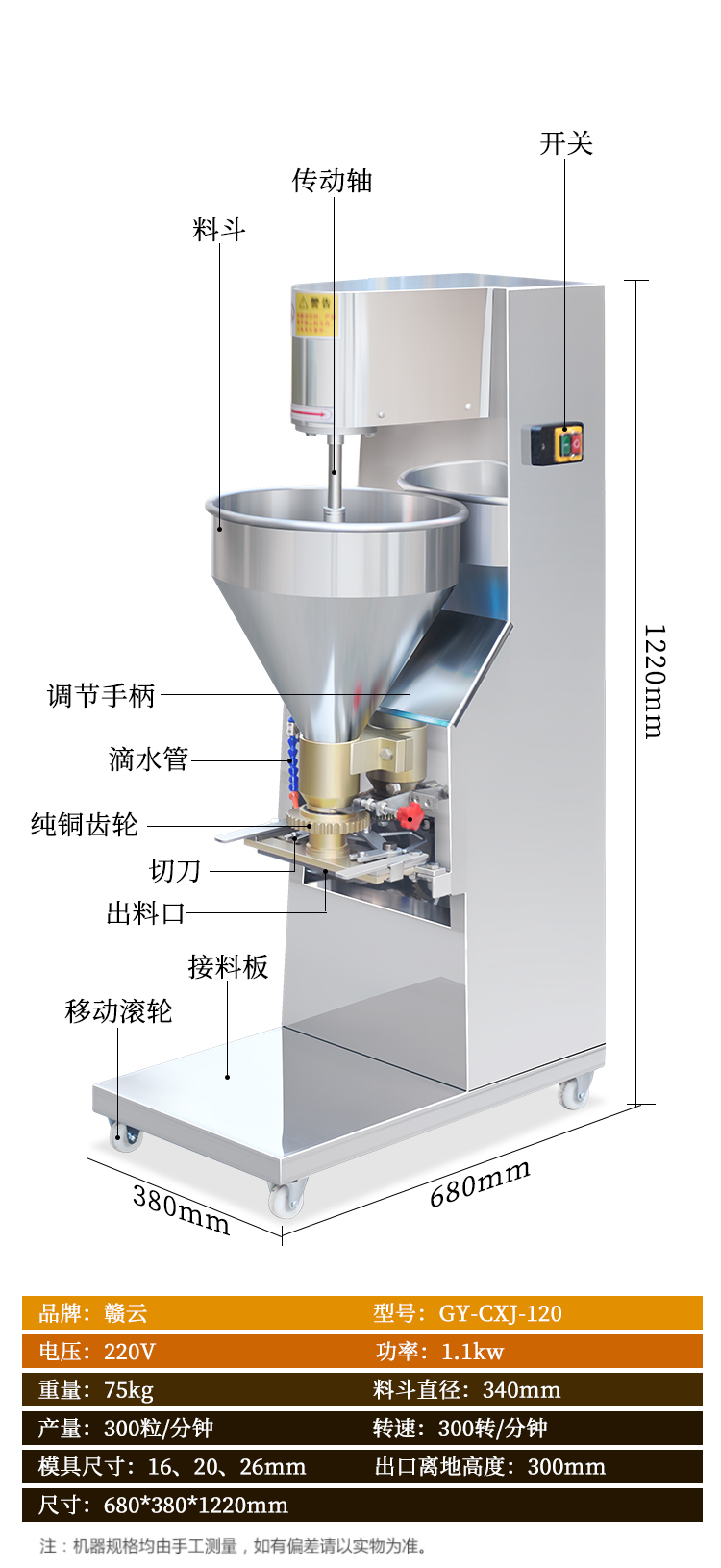 贛云推出這款快速肉丸成型機,每分鐘可成型300個實心小肉丸,這臺設(shè)備具有成型速度快、操作簡單,可做直徑15mm-28mm的丸子,丸子大小有模具控制,隨機配有三個模具,15mm、20mm和25mm,其他規(guī)格需定做。