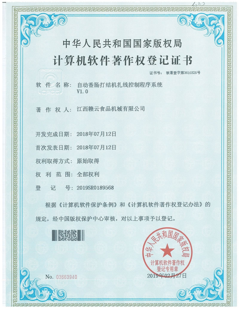 計(jì)算機(jī)軟件著作權(quán)登記證書(自動(dòng)香腸打結(jié)機(jī)扎線控制程序系統(tǒng))