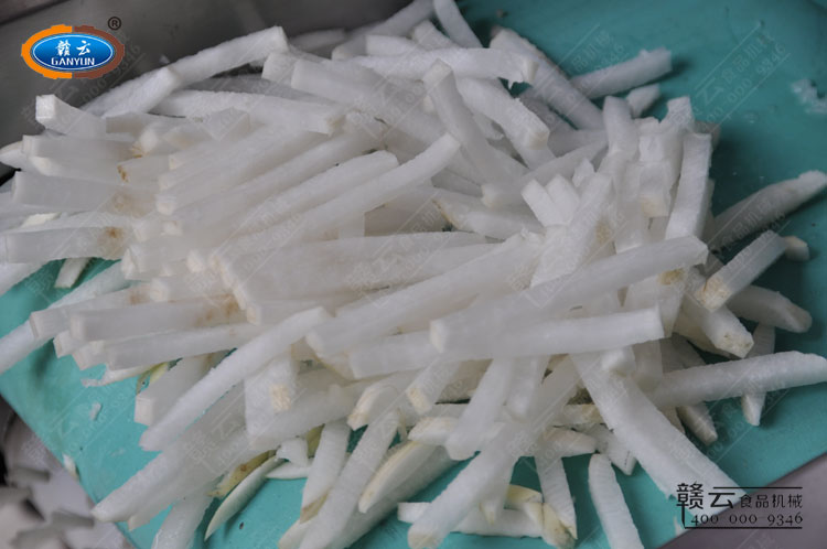 贛州市贛云食品機(jī)械廠專業(yè)生產(chǎn)銷售切菜機(jī)、切丁機(jī)、切條機(jī)、切片機(jī)等多功能系列切菜設(shè)備,山東客戶定做1000B型切菜機(jī)切蘿卜條,定做8mm切條刀具試機(jī)效果展示圖片賞析,菜場購買的大白蘿卜,最大直徑約90mm,切出來的蘿卜條規(guī)格為8*8*90mm,以下是本次試機(jī)實際效果圖片賞析: