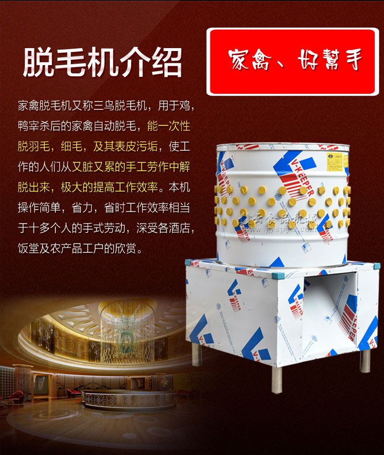 我們生產(chǎn)的這款打雞鴨毛的機(jī)器內(nèi)置的都是國(guó)標(biāo)銅芯電機(jī),可以供您用很久很久,每一臺(tái)全自動(dòng)家禽褪毛機(jī)出廠之前都是經(jīng)過了測(cè)試的,確保每一臺(tái)的實(shí)用性,加工廠雞鴨脫毛機(jī)操作簡(jiǎn)單方便,只需要將燙好的雞鴨扔進(jìn)去啟動(dòng)機(jī)器即可,雞鴨鵝脫毛機(jī)器一直以來(lái)都是非常受歡迎的好設(shè)備,有需要的可隨時(shí)撥打電話。8373422對(duì)于全自動(dòng)家禽褪毛機(jī)我們是全國(guó)聯(lián)保一年的,無(wú)論您是在哪個(gè)城市均可以,一直以來(lái)我們都以生產(chǎn)加工廠雞鴨脫毛機(jī)為主要目標(biāo),現(xiàn)如今雞鴨鵝脫毛機(jī)器已經(jīng)深得大眾的支持和好評(píng)了,打雞鴨毛的機(jī)器現(xiàn)已紅遍大江南北,成為食品加工業(yè)不可缺少的一款設(shè)備,更多詳情歡迎隨時(shí)來(lái)電。